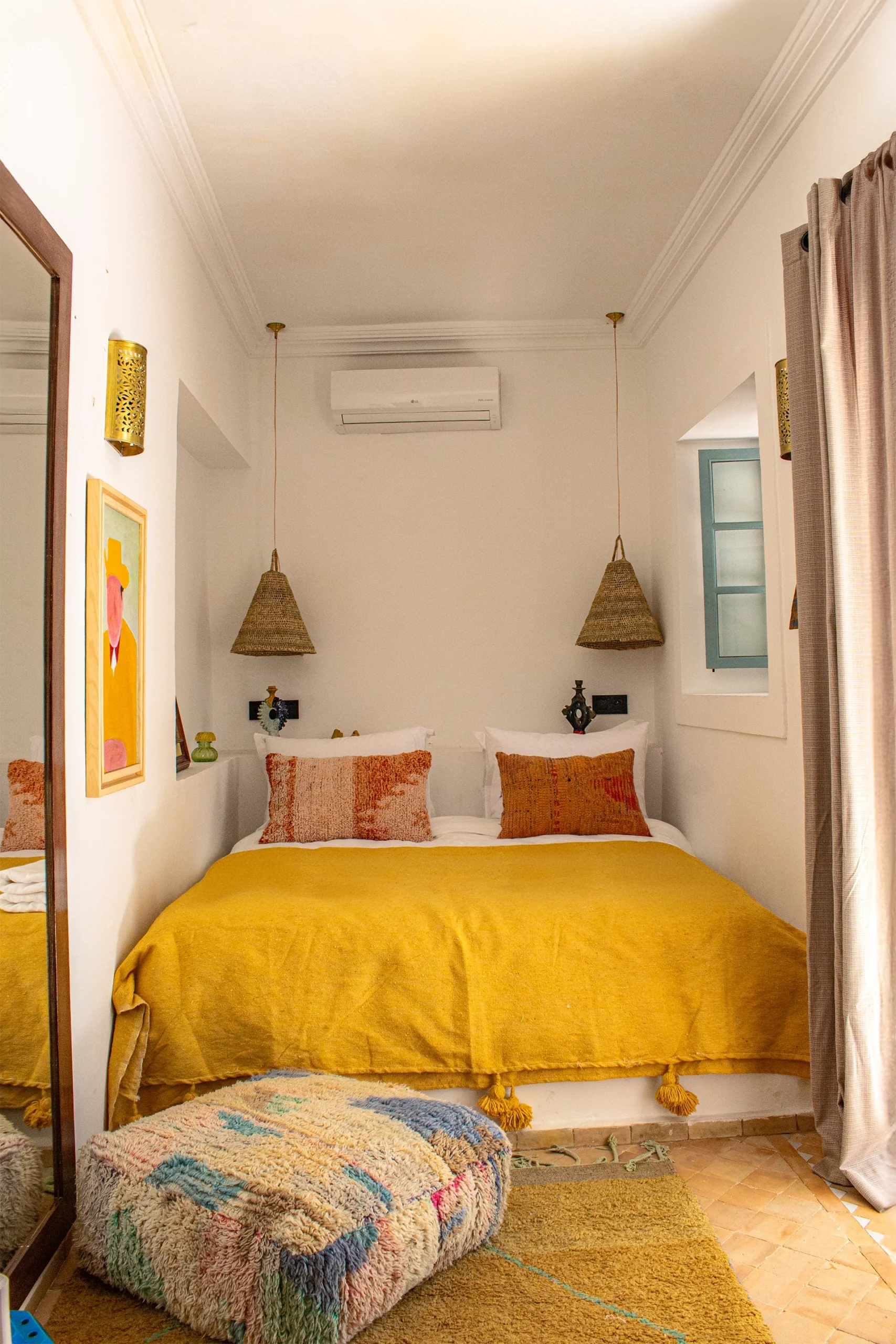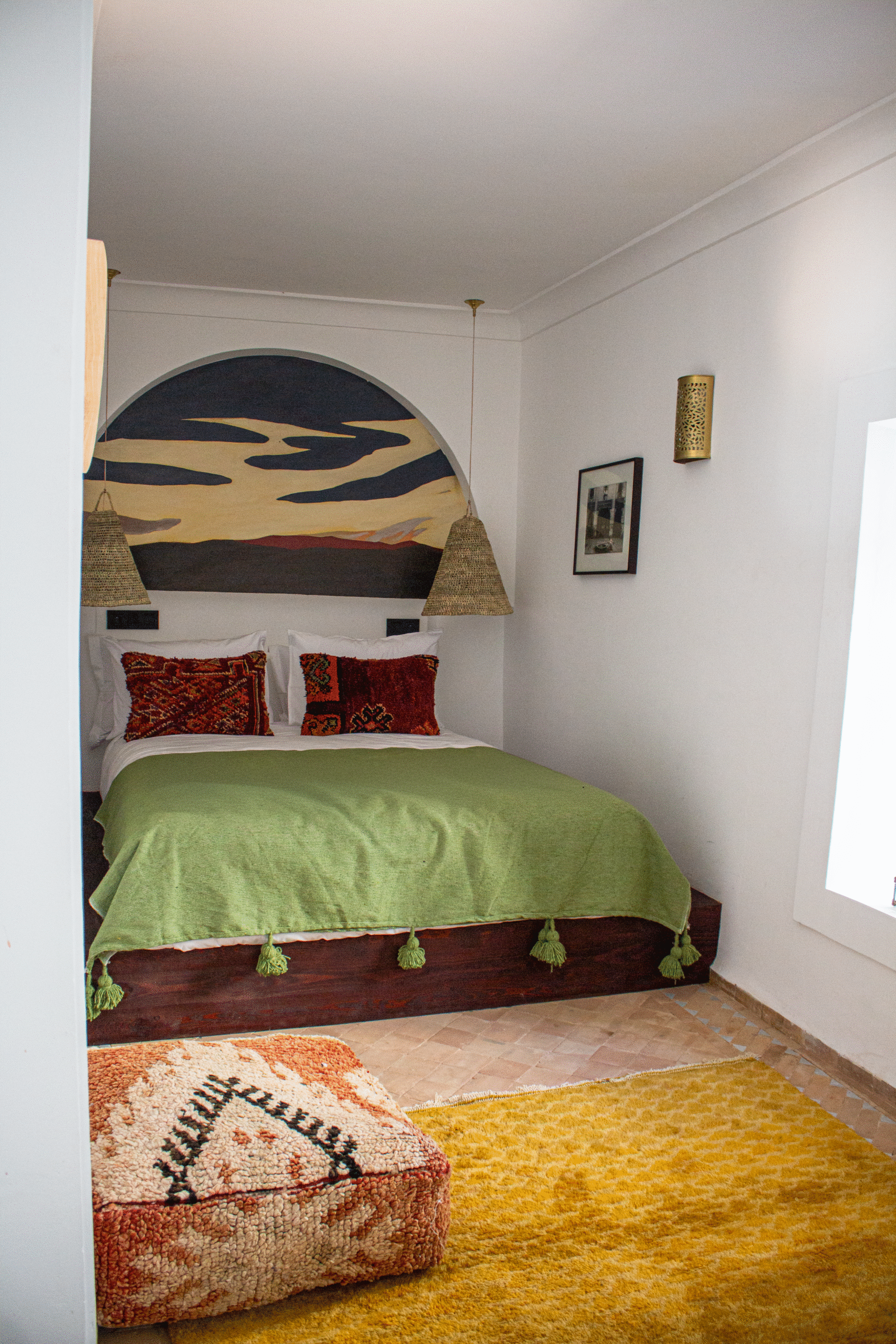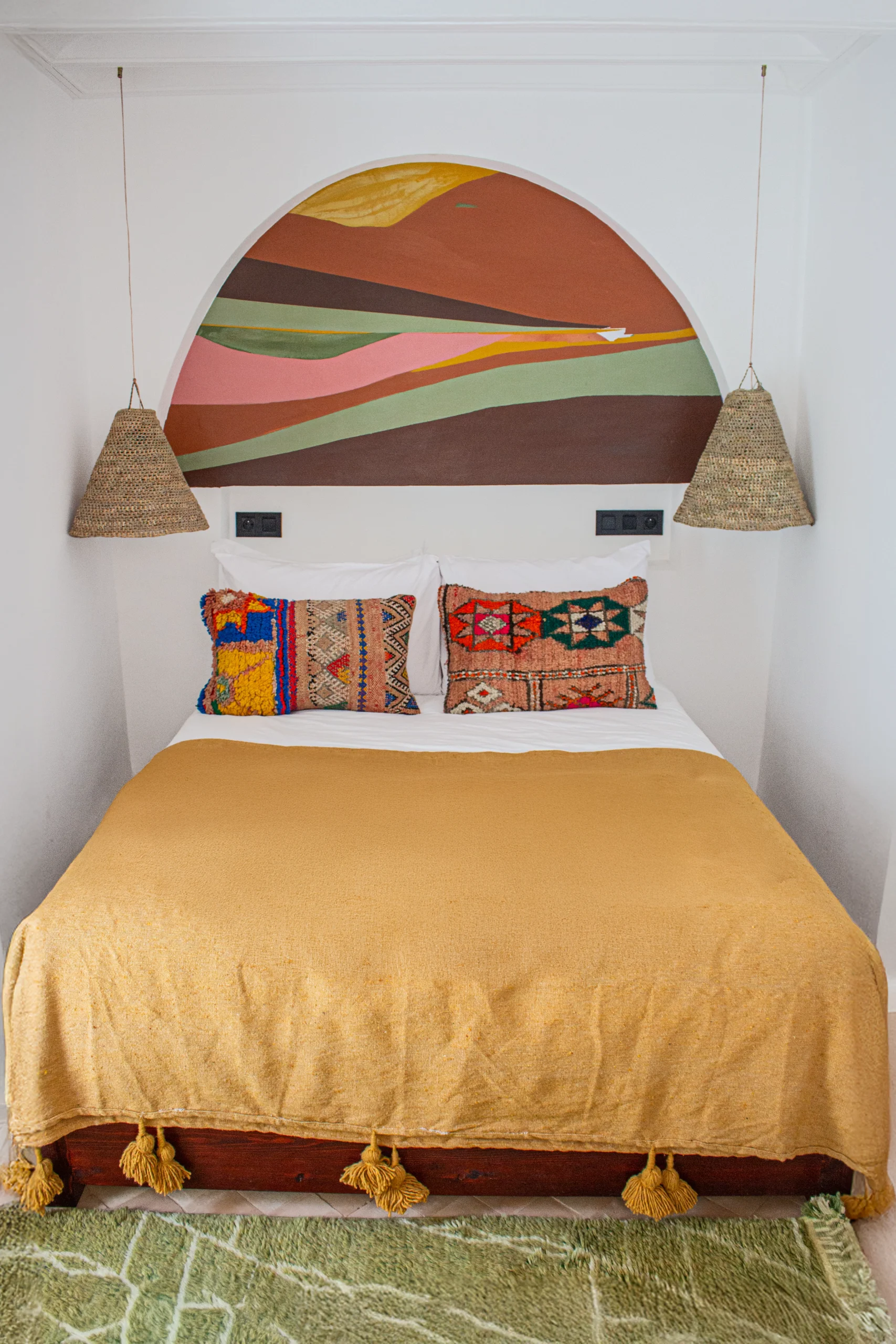 Bathed in warm golden tones, Ghorob Room is situated on the ground floor, opening onto the patio. It draws its name and spirit from the softness of sunset. It’s an intimate, light-filled space that blends simplicity with soul, where woven textures, hand-picked art, and vintage finds tell a quiet story of Moroccan life...